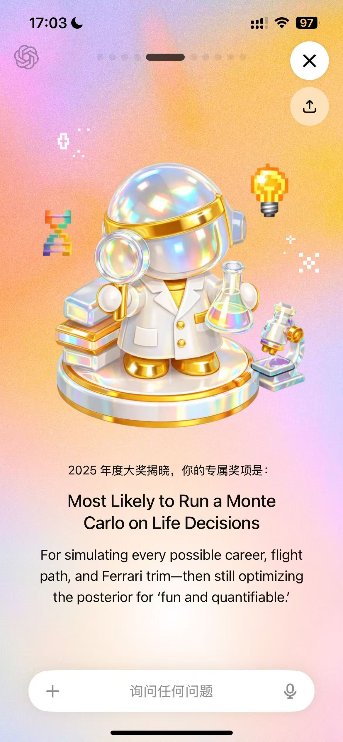 I play tennis and am currently self-rated NTRP 3.5. My favorite band is The Landlord’s Cats. According to ChatGPT, if 2025 gave out awards, I’d get Most Likely to Run a Monte Carlo on Life Decisions – for simulating every possible career, flight path, and Ferrari trim, then still optimizing the posterior for fun and quantifiable.